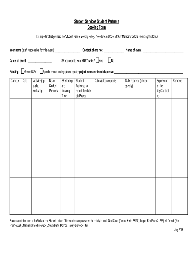 Student Services Student Partners Booking Form (It is important that you read the Student Partner Booking Policy, Procedure and Roles of Staff Members before submitting this form.) Your name (staff