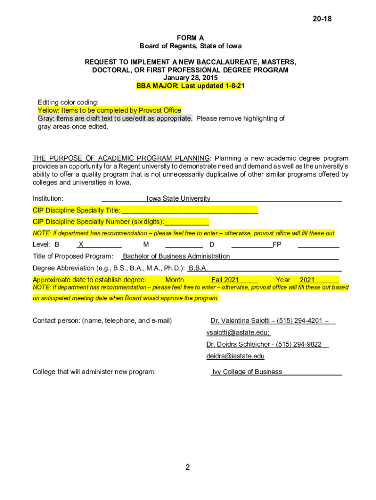 2018 FORM A Board of Regents, State of Iowa REQUEST TO IMPLEMENT A NEW BACCALAUREATE, MASTERS, DOCTORAL, OR FIRST PROFESSIONAL DEGREE PROGRAM January 28, 2015, BBA MAJOR: Last updated 1821 Editing