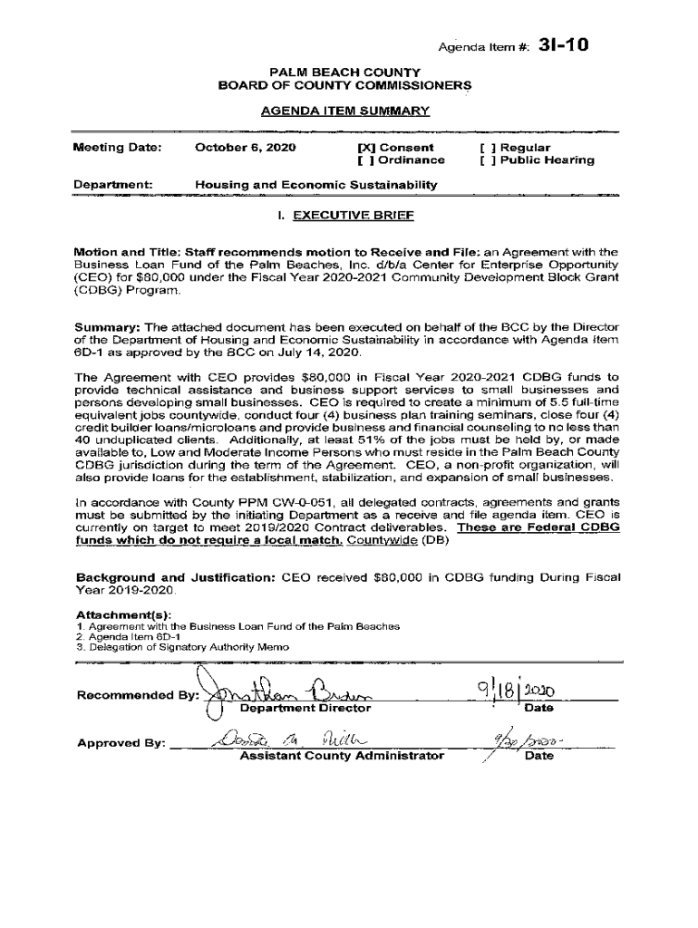 Agenda Item#:3110PALM BEACH COUNTY BOARD OF COUNTY COMMISSIONER AGENDA ITEM SUMMARY Meeting Date:October 6, 2020Department:Housing and Economic Sustainability[X] Consent [ ] Ordinance[ ] Regular [