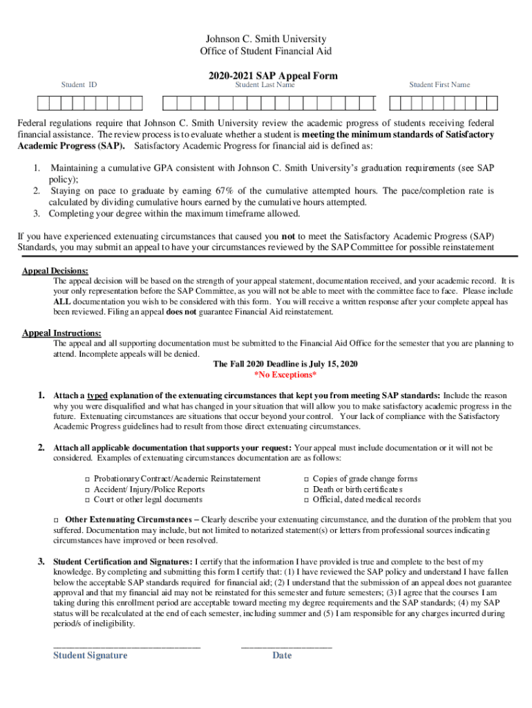 Johnson C. Smith University Office of Student Financial Aid 20202021 SAP Appeal Form Student Last NameStudent First Name Federal regulations require that Johnson C. Smith University review the academic