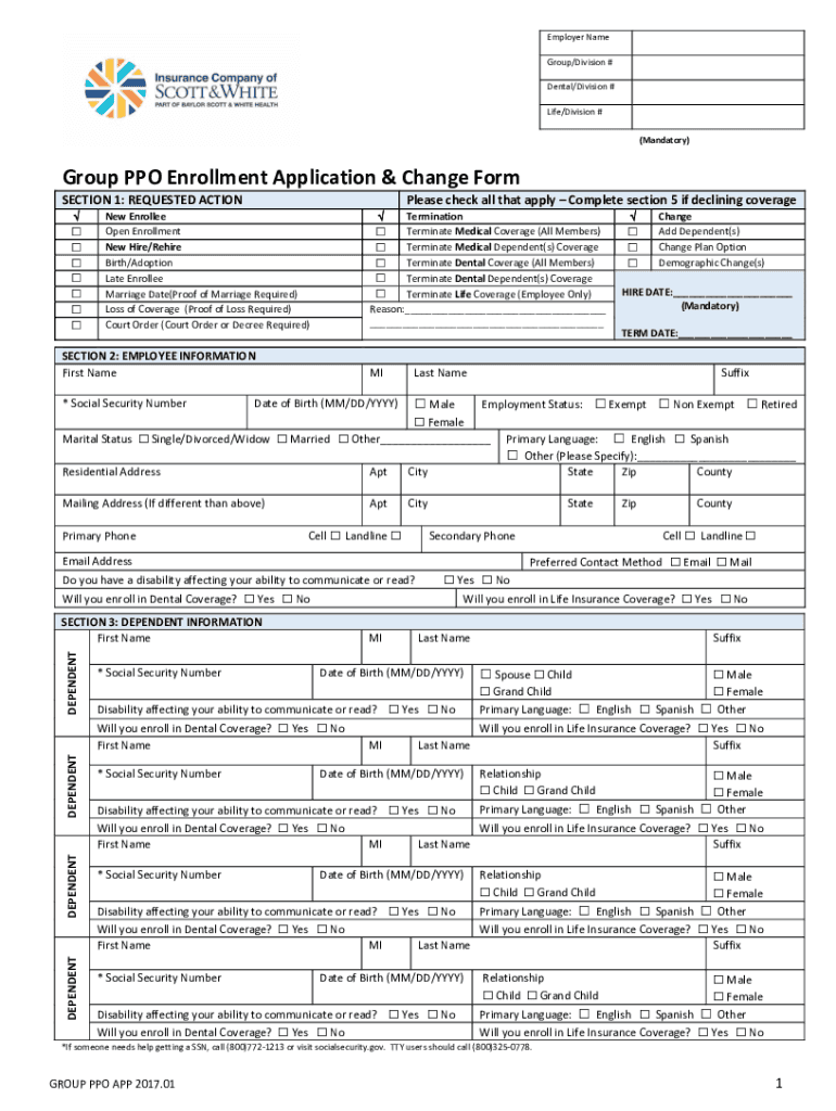 Employer Name Group/Division # Dental/Division # Life/Division # (Mandatory)Group PPO Enrollment Application & Change Form SECTION 1: REQUESTED ACTION Please check all that apply Complete section