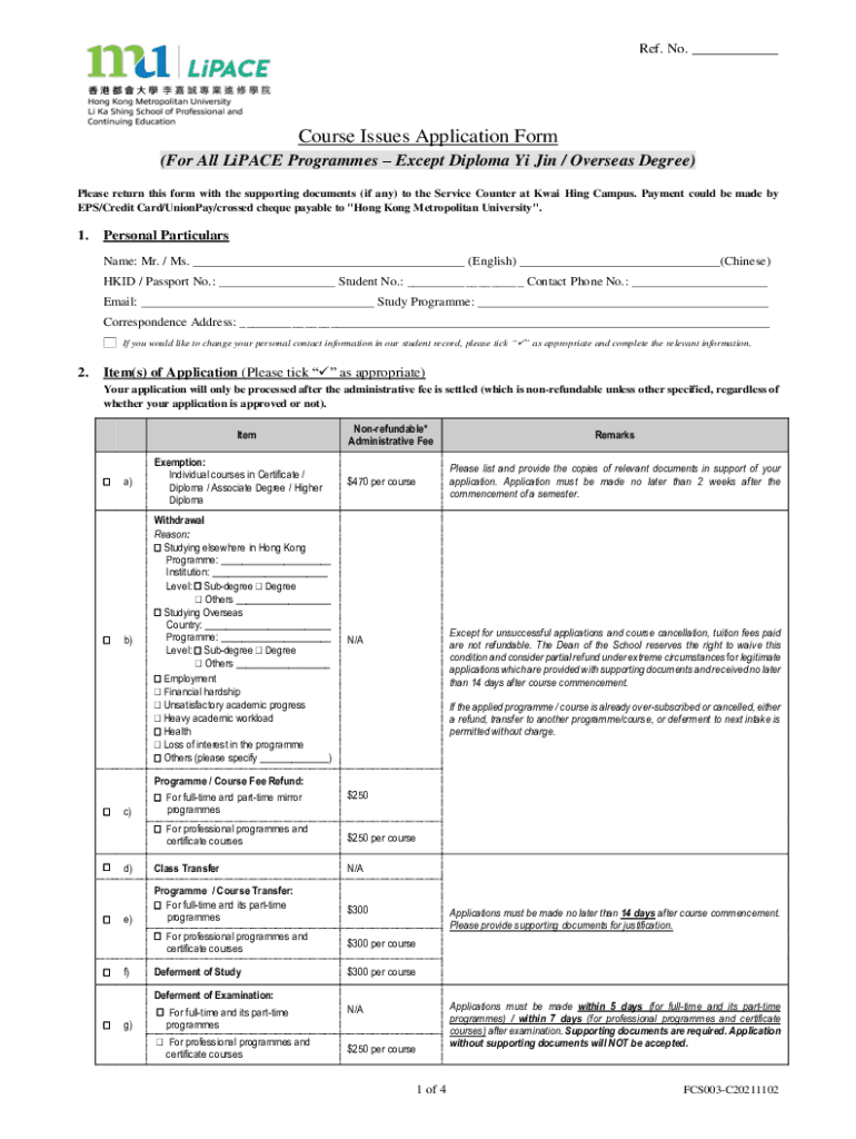 Ref. No.___Course Issues Application Form (For All Lipase Programs Except Diploma I Jin / Overseas Degree) Please return this form with the supporting documents (if any) to the Service Counter at