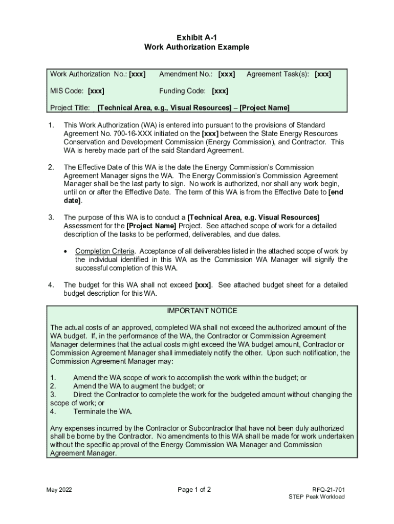 Exhibit A1 Work Authorization Example Work Authorization No.: [xxx]Amendment No.: [xxx]MIS Code: [xxx]Funding Code: [xxx]Project Title:Agreement Task(s): [xxx][Technical Area, e.g., Visual Resources]