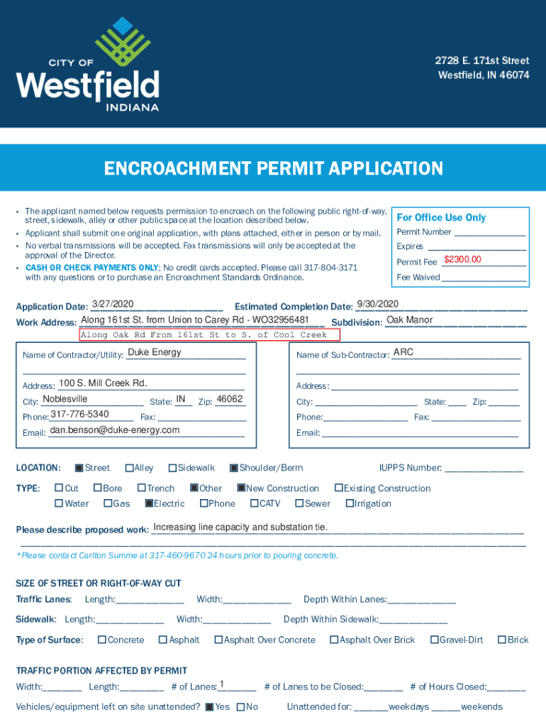 2728 E. 171st Street Westfield, IN 46074ENCROACHMENT PERMIT APPLICATION The applicant named below requests permission to encroach on the following public rightofway, street, sidewalk, alley or other
