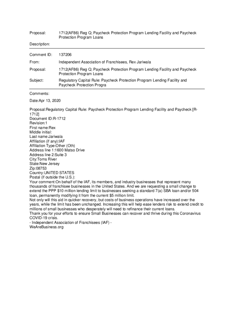 Proposal:1712(AF86) Reg Q; Paycheck Protection Program Lending Facility and Paycheck Protection Program LoansDescription: Comment ID:137206From:Independent Association of Franchisees, Rex JariwalaProposal:1712(AF86)