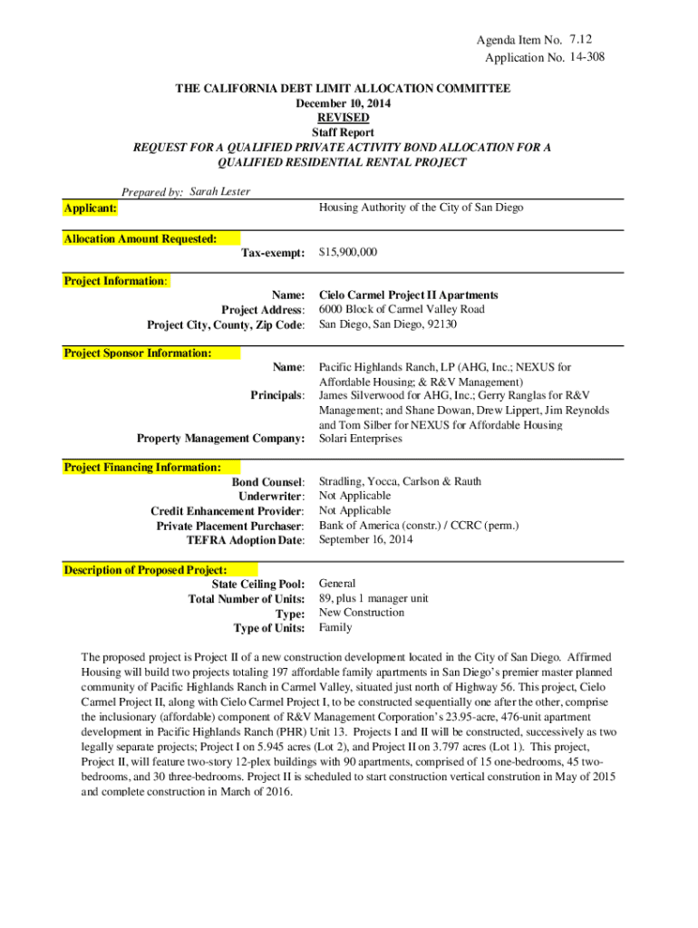 Agenda Item No. 7.12 Application No. 14308 THE CALIFORNIA DEBT LIMIT ALLOCATION COMMITTEE December 10, 2014, REVISED Staff Report REQUEST FOR A QUALIFIED PRIVATE ACTIVITY BOND ALLOCATION FOR A QUALIFIED