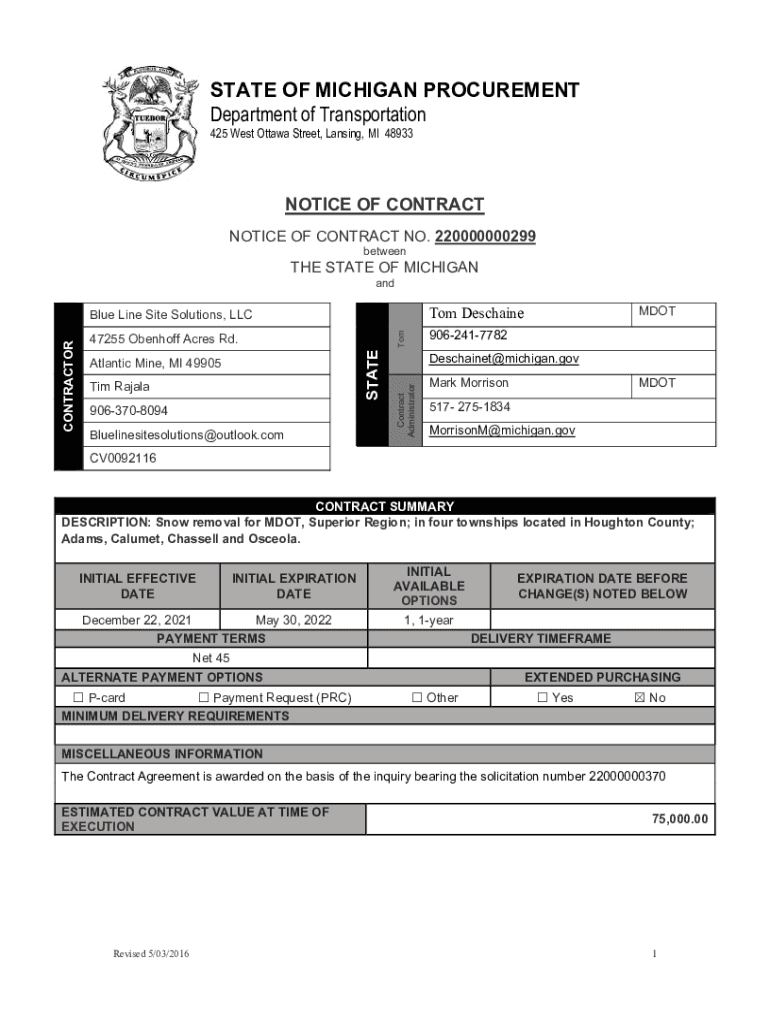 STATE OF MICHIGAN PROCUREMENT Department of Transportation 425 West Ottawa Street, Lansing, MI 48933NOTICE OF CONTRACT NOTICE OF CONTRACT NO. 220000000299. Between STATE OF MICHIGAN Tom Deschaine47255