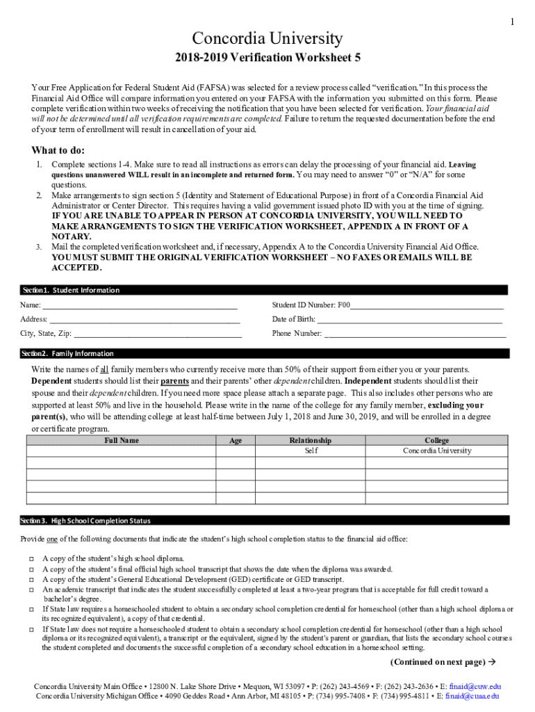 1Concordia University 20182019 Verification Worksheet 5 Your Free Application for Federal Student Aid (FAFSA) was selected for a review process called verification. In this process the Financial Aid