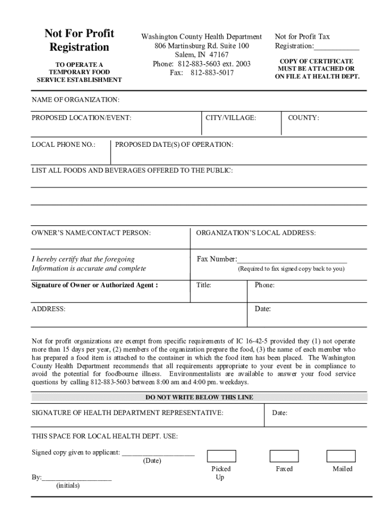 Not For Profit Registration TO OPERATE A TEMPORARY FOOD SERVICE ESTABLISHMENT Washington County Health Department 806 Martinsburg Rd. Suite 100 Salem, IN 47167 Phone: 8128835603 ext. 2003 Fax: 8128835017Not