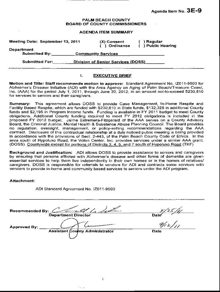 Agenda Item No.3E9PALM BEACH COUNTY BOARD OF COUNTY COMMISSIONERS AGENDA ITEM SUMMARY Meeting Date: September 13, 2011(X) Consent () Ordinance() Regular () Public HearingDepartment Submitted By: ___C.;;_community\”\”\”