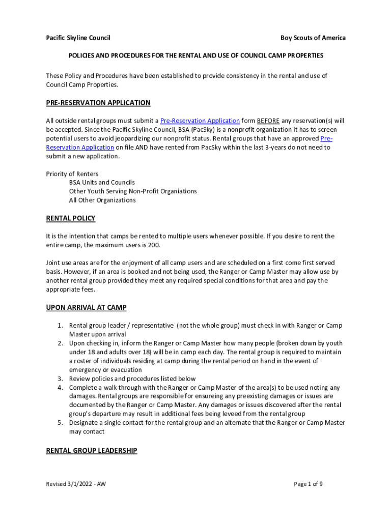 Pacific Skyline Councilor Scouts of AmericaPOLICIES AND PROCEDURES FOR THE RENTAL AND USE OF COUNCIL CAMP PROPERTIES These Policy and Procedures have been established to provide consistency in the