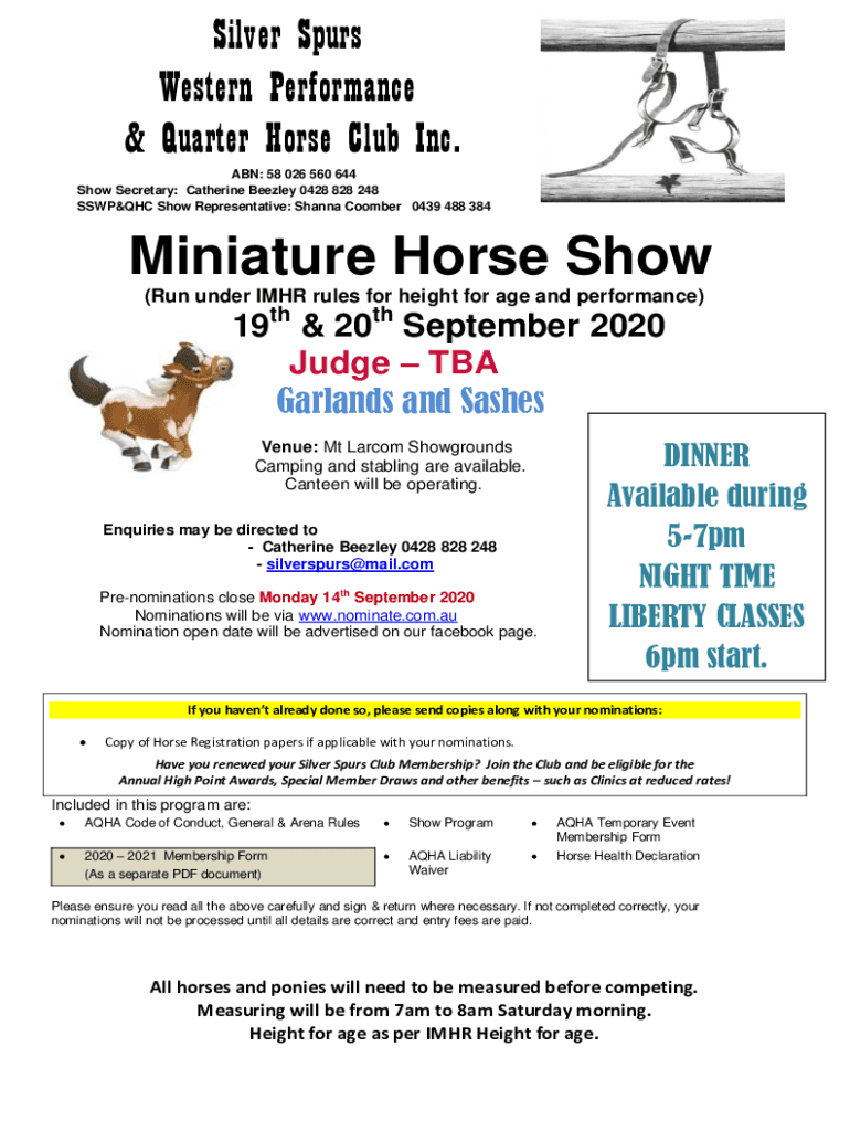 Silver Spurs Western Performance & Quarter Horse Club Inc. ABN: 58 026 560 644 Show Secretary: Catherine Beetles 0428 828 248 SSWP&QHC Show Representative: Shanna Comber 0439 488 384Miniature Horse