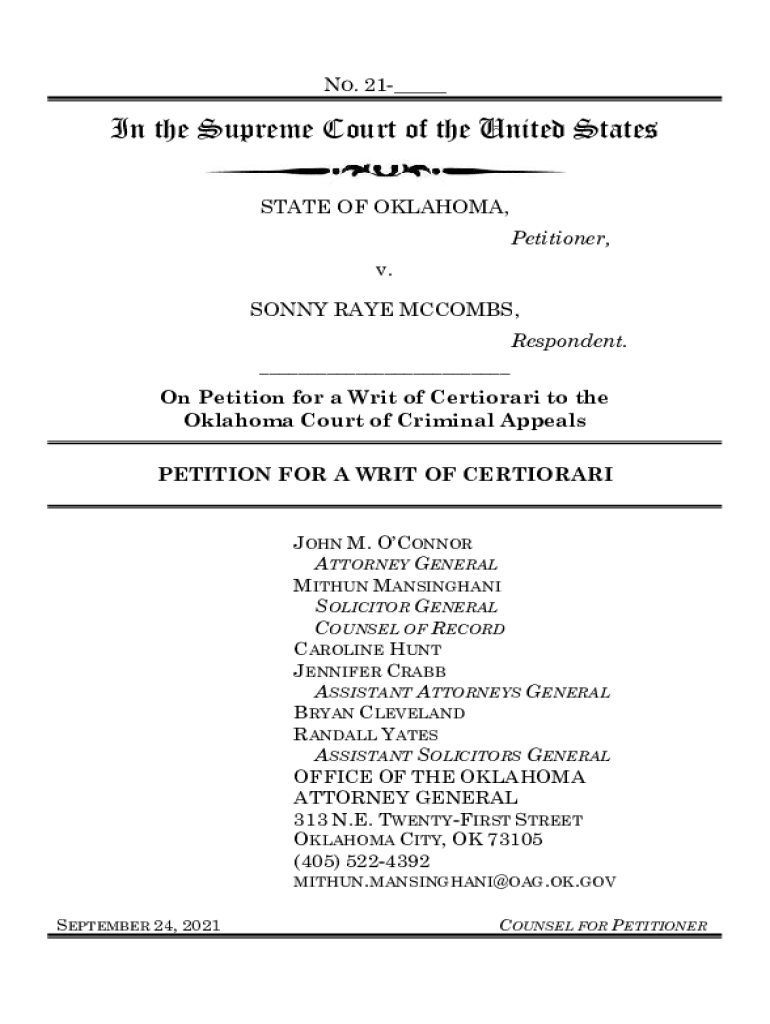 NO. 21___In the Supreme Court of the United States STATE OF OKLAHOMA, Petitioner, v. SONNY RACE McComb, Respondent. ___On Petition for a Writ of Certiorari to the Oklahoma Court of Criminal Appeals