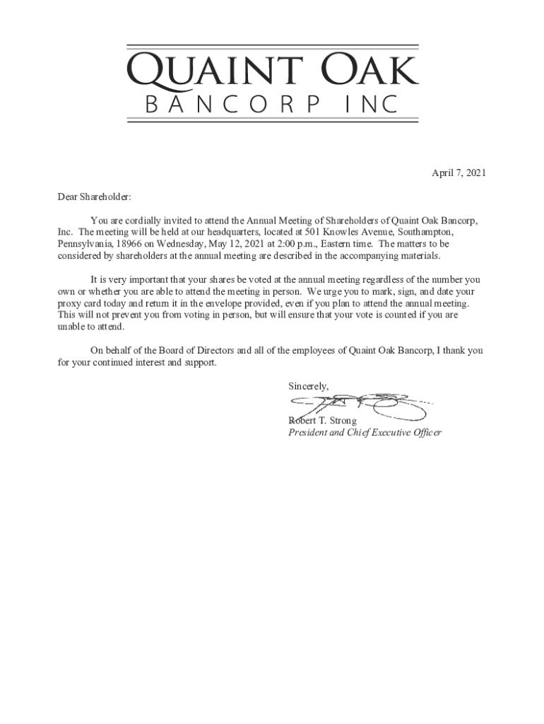 April 7, 2021, Dear Shareholder: You are cordially invited to attend the Annual Meeting of Shareholders of Quaint Oak Ban corp, Inc. The meeting will be held at our headquarters, located at 501 Knowles