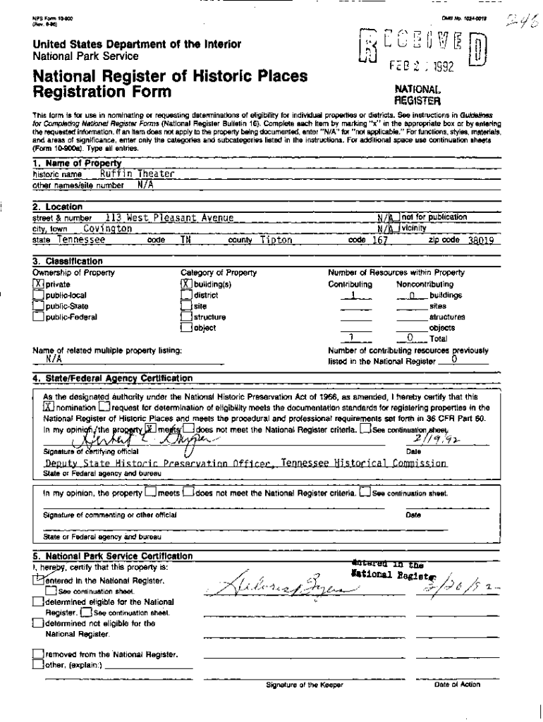 OMB NO. 10244019NPS Form 10800 (Rev. 886)United States Department of the Interior National Park Service FED 2,1992National Register of Historic Places Registration Formation Registers form is for