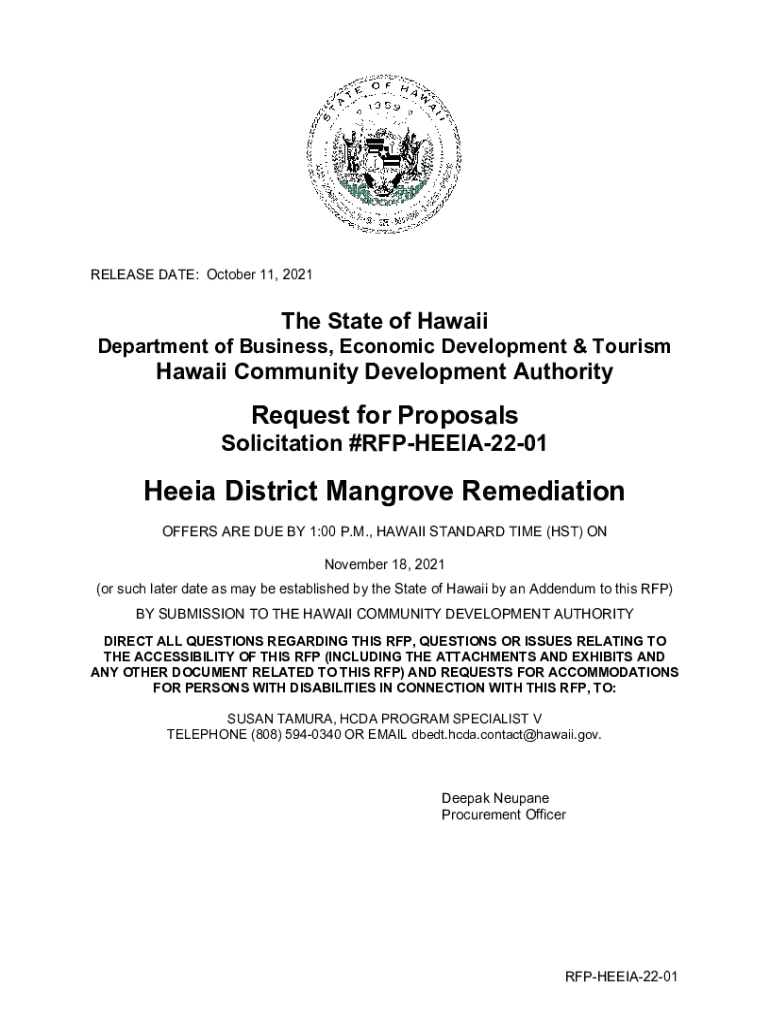 RELEASE DATE: October 11, 2021The State of Hawaii Department of Business, Economic Development & Tourism Hawaii Community Development AuthorityRequest for Proposals Solicitation #RFPHEEIA2201Heeia