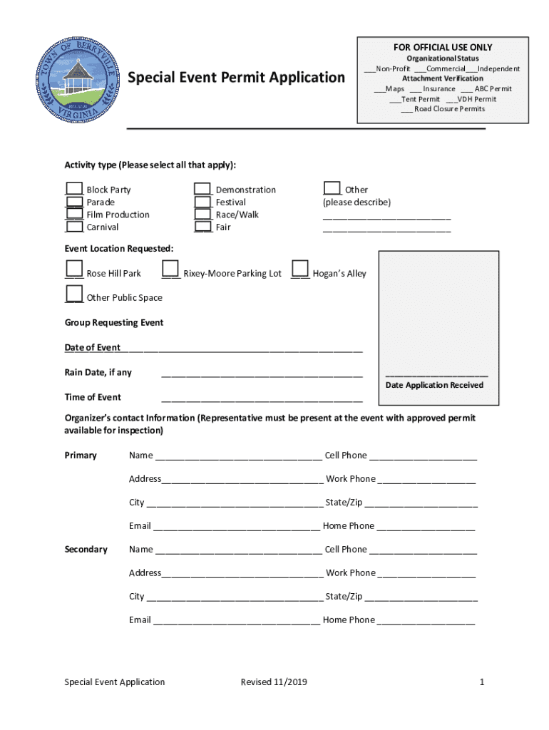FOR OFFICIAL USE ONLYSpecial Event Permit ApplicationOrganizational Status ___Nonprofit ___Commercial___Independent Attachment Verification ___Maps ___ Insurance ___ ABC Permit ___Tent Permit ___VH