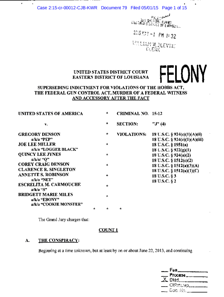 Case 2:15cr00012CJBKWR Document 79 Filed 05/01/15-Page 1 of 15UNITED STATES DISTRICT COURT EASTERN DISTRICT OF LOUISIANAFELONYSUPERSEDING INDICTMENT FOR VIOLATIONS OF THE HOBBS ACT, THE FEDERAL GUN