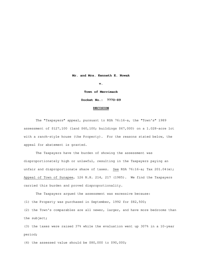 Mr. and Mrs. Kenneth E. Noway v. Town of Merrimack Docket No.:777089DECISIONThe \” Taxpayers\” appeal, pursuant to RSA 76:16a, the \” Town\'s\” 1989 assessment of $127,100 (land $60,100; buildings