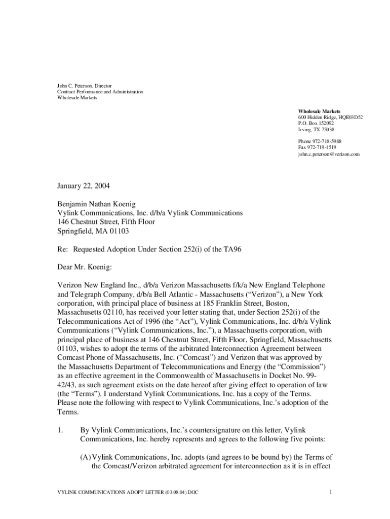 John C. Peterson, Director Contract Performance and Administration Wholesale Markets 600 Hidden Ridge, HQE03D52 P.O. Box 152092 Irving, TX 75038 Phone 9727185988 Fax 9727191519 john.c.peterson@verizon.comJanuary
