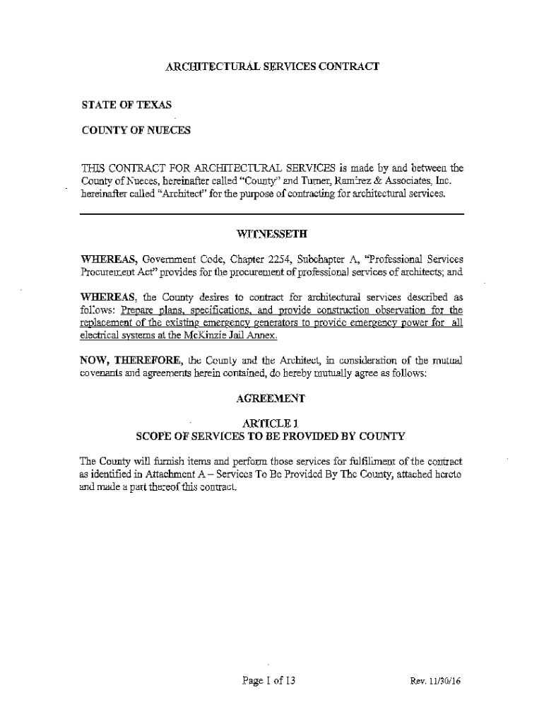 ARCHITECTURAL SERVICES CONTRACT STATE OF TEXAS COUNTY OF NUECESTIllS CONTRACT FOR ARCHITECTURAL SERVICES is made by and between the County offices, hereinafter called \” County\” and Turner, Ramirez