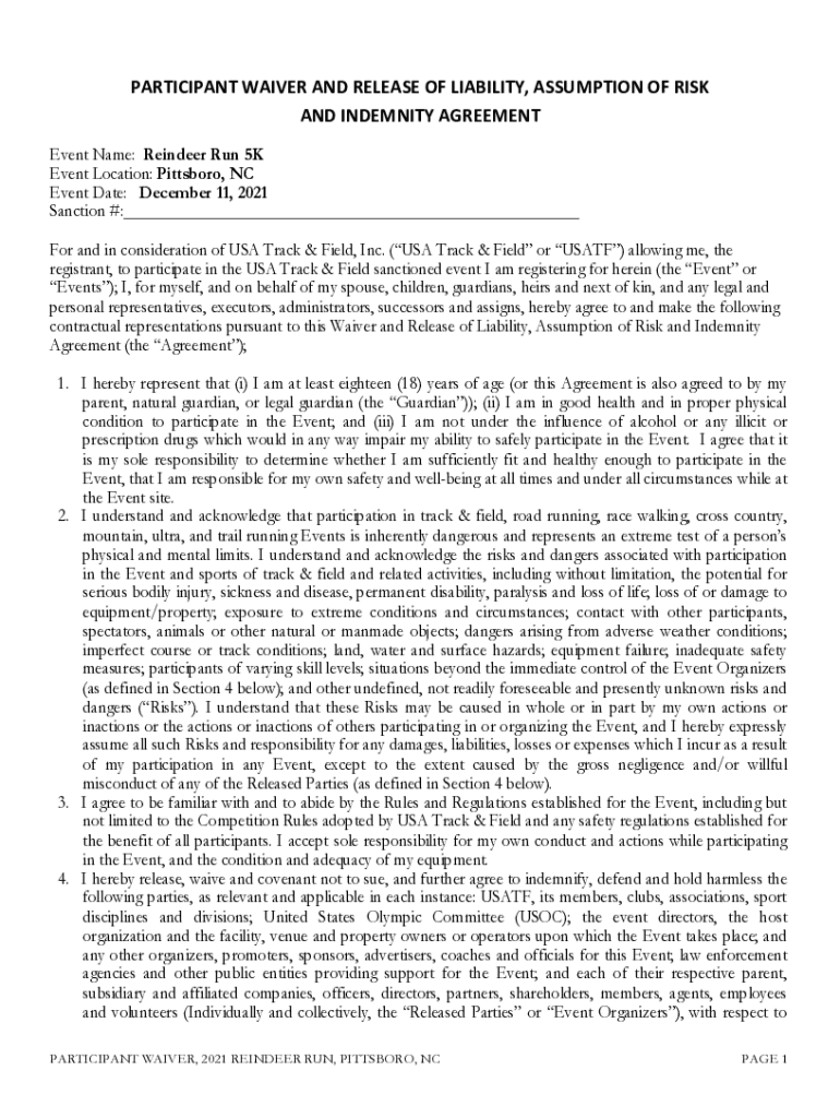 PARTICIPANT WAIVER AND RELEASE OF LIABILITY, ASSUMPTION OF RISK AND INDEMNITY AGREEMENTEvent Name: Reindeer Run 5K Event Location: Pittsburgh, NC Event Date: December 11, 2021, Sanction #: For and