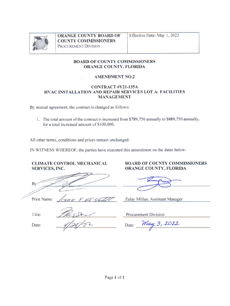 3/25/2022ORANGE COUNTY, FLORIDAProcurement DivisionCONTRACT NO. Y21135A HVAC INSTALLATION AND REPAIR SERVICES LOT A: FACILITIES MANAGEMENT DIVISION This contract is not valid unless bilaterally executed.