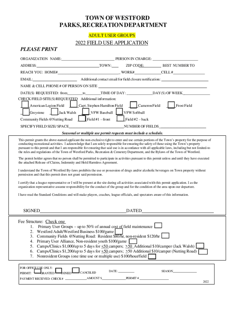 TOWN OF WESTWARD PARKS, RECREATION DEPARTMENT ADULT USER GROUPS2022 FIELD USE APPLICATION PLEASE PRINT ORGANIZATION NAME:_ PERSON IN CHARGE:ADDRESS:TOWN:REACH YOU: HOME#ZIP CODE:BEST NUMBER TO_ WORK#EMAIL:CELL