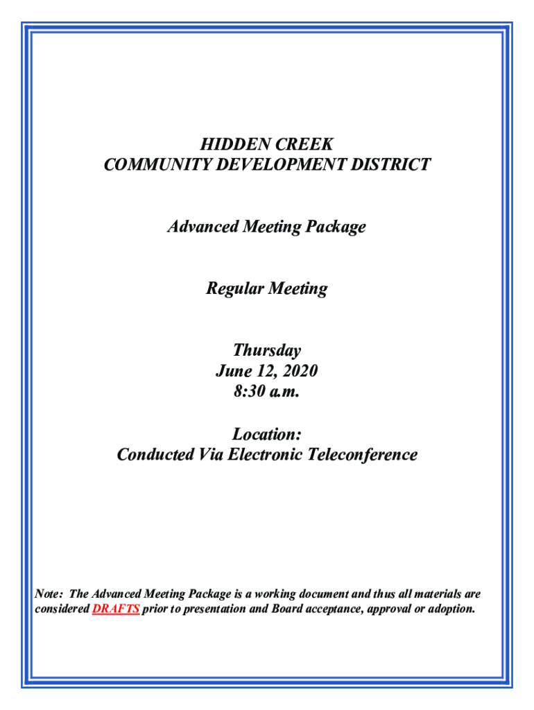 HIDDEN CREEK COMMUNITY DEVELOPMENT DISTRICT Advanced Meeting Package Regular Meeting Thursday, June 12, 2020 8:30 a.m. Location: Conducted Via Electronic TeleconferenceNote: The Advanced Meeting Package