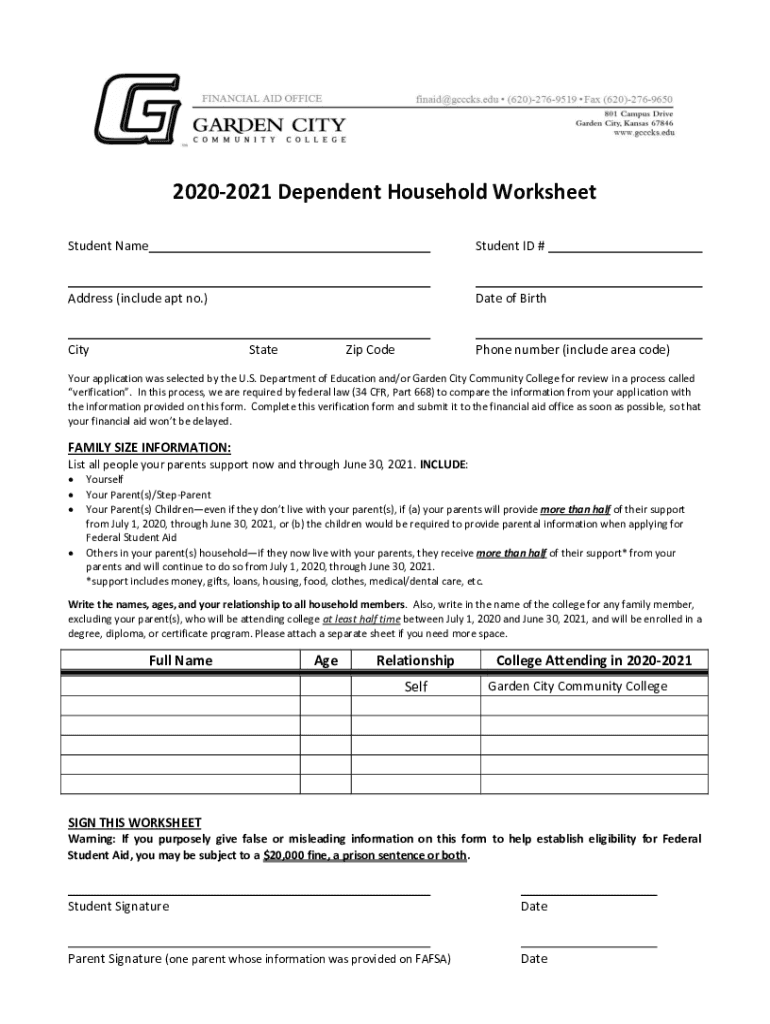 20202021 Dependent Household Worksheet Student NameStudent ID #Address (include apt no.) Date of BirthCityStateZip Telephone number (include area code)Your application was selected by the U.S. Department