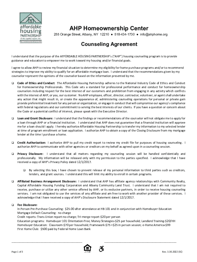 HP Homeownership Center 255 Orange Street, Albany, NY 12210 5184341730 info@ahphome.org Counseling Agreement IunderstandthatthepurposeoftheAFFORDABLEHOUSINGPARTNERSHIPs(HP)housingcounselingprogramistoprovide