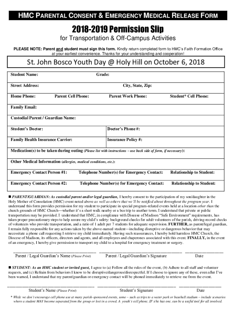 HMC PARENTAL CONSENT & EMERGENCY MEDICAL RELEASE FORM20182019 Permission Slip for Transportation & Campus Activities PLEASE NOTE: Parent and student must sign this form. Kindly return completed form