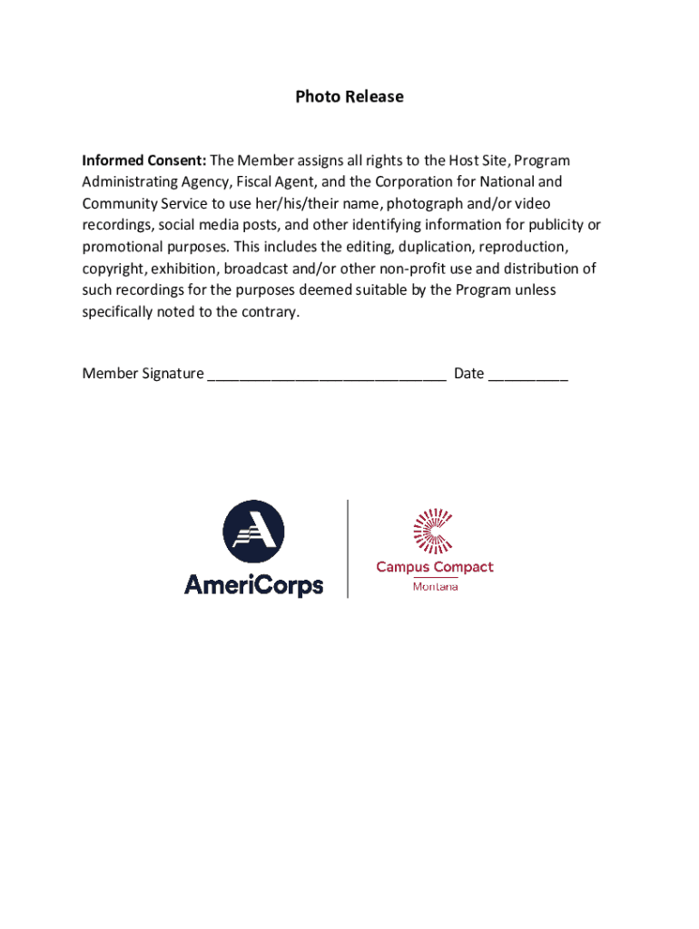 Photo Release Informed Consent: The Member assigns all rights to the Host Site, Program Administrating Agency, Fiscal Agent, and the Corporation for National and Community Service to use her/his/their