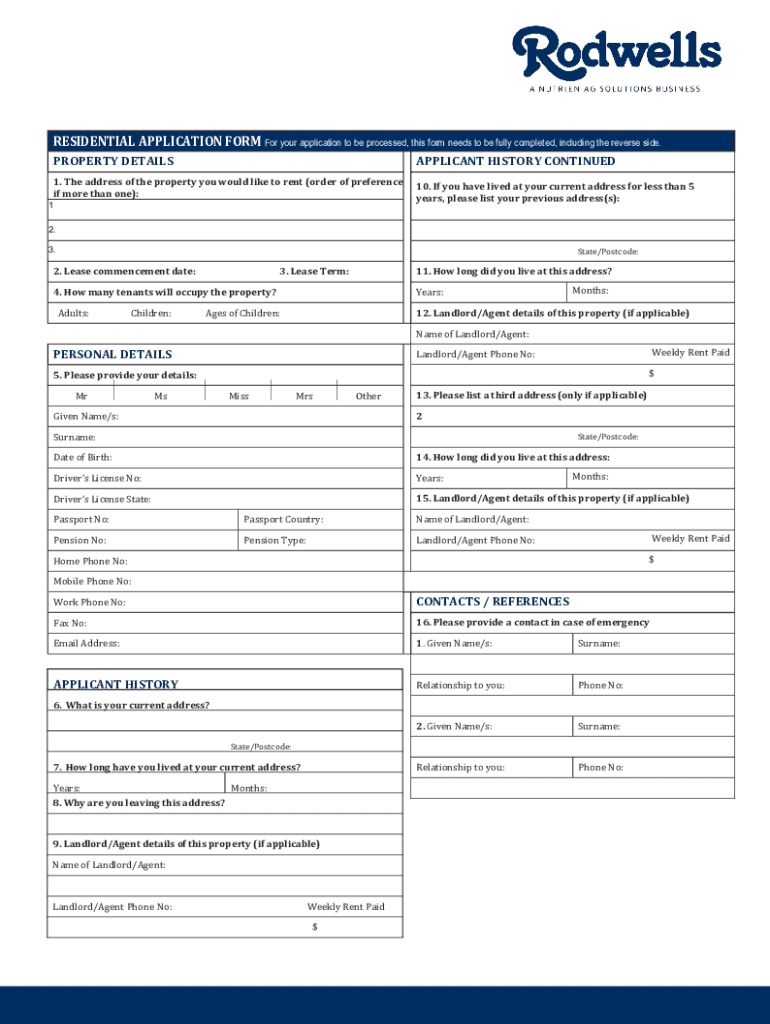 The Rodwells - rental application is a form that must be completed by individuals looking to rent a property through Rodwells Real Estate.