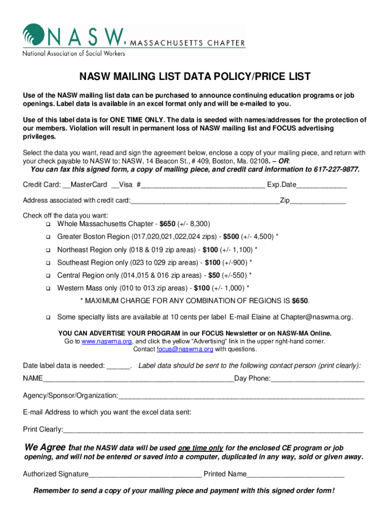 NASA MAILING LIST DATA POLICY/PRICE LIST Use of the NASA mailing list data can be purchased to announce continuing education programs or job openings. Label data is available in an Excel format only