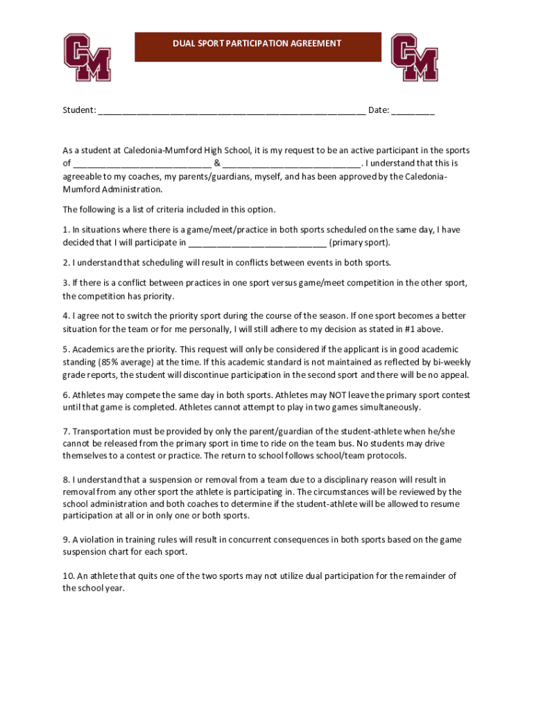 DUAL SPORT PARTICIPATION AGREEMENTStudent: ___ Date: ___As a student at Caledonia Mumford High School, it is my request to be an active participant in the sports of ___ & ___. I understand that this