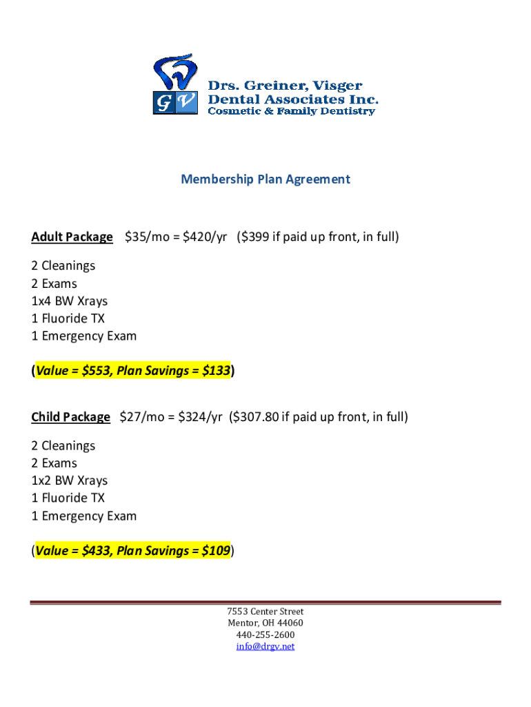 Membership Plan AgreementAdult Package $35/mo $420/yr ($399 if paid up front, in full) 2 Cleanings 2 Exams 1×4 BY Rays 1 Fluoride TX 1 Emergency Exam (Value $553, Plan Savings $133) Child Package