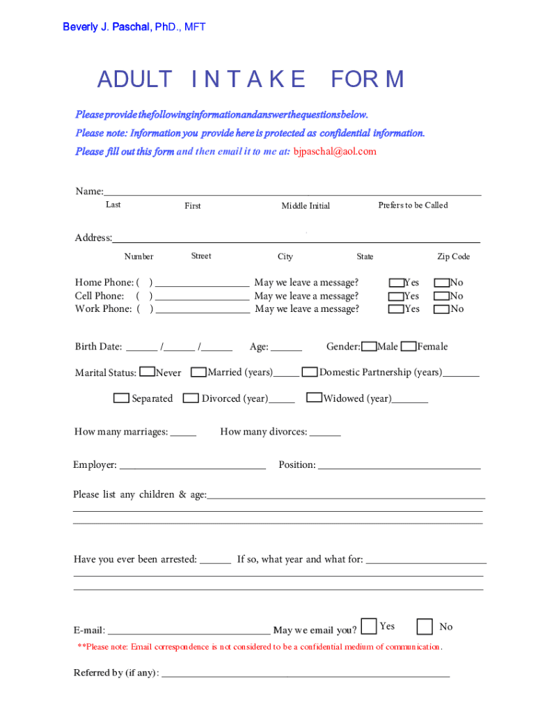 Beverly J. Paschal, PhD., pH ADULT I N T A KE FOR Please provide thefollowinginformation andanswerthequestionsbelow. Please note: Information you provide here is protected as confidential information.