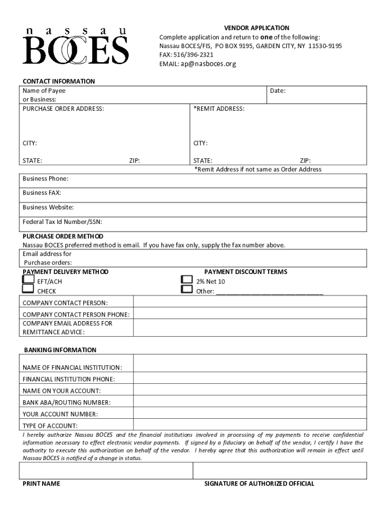 VENDOR APPLICATION Complete application and return to one of the following: Nassau BONES/IS, PO BOX 9195, GARDEN CITY, NY 115309195 FAX: 516/3962321 EMAIL: ap@nasboces.org CONTACT INFORMATION Name