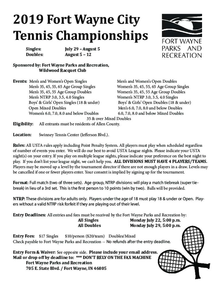 2019 Fort Wayne City Tennis ChampionshipsSingles:Doubles:July 29 August 5 August 5 12Sponsored by: Fort Wayne Parks and Recreation, Wildwood Racquet Club Events:Men and Women's Open Singleness and