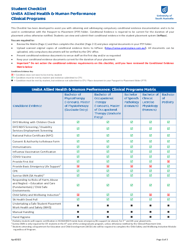 This Checklist has been developed to assist you with obtaining and safekeeping compulsory conditional evidence documentation and is to be used in combination with the Passport to Placement (PTP) folder.