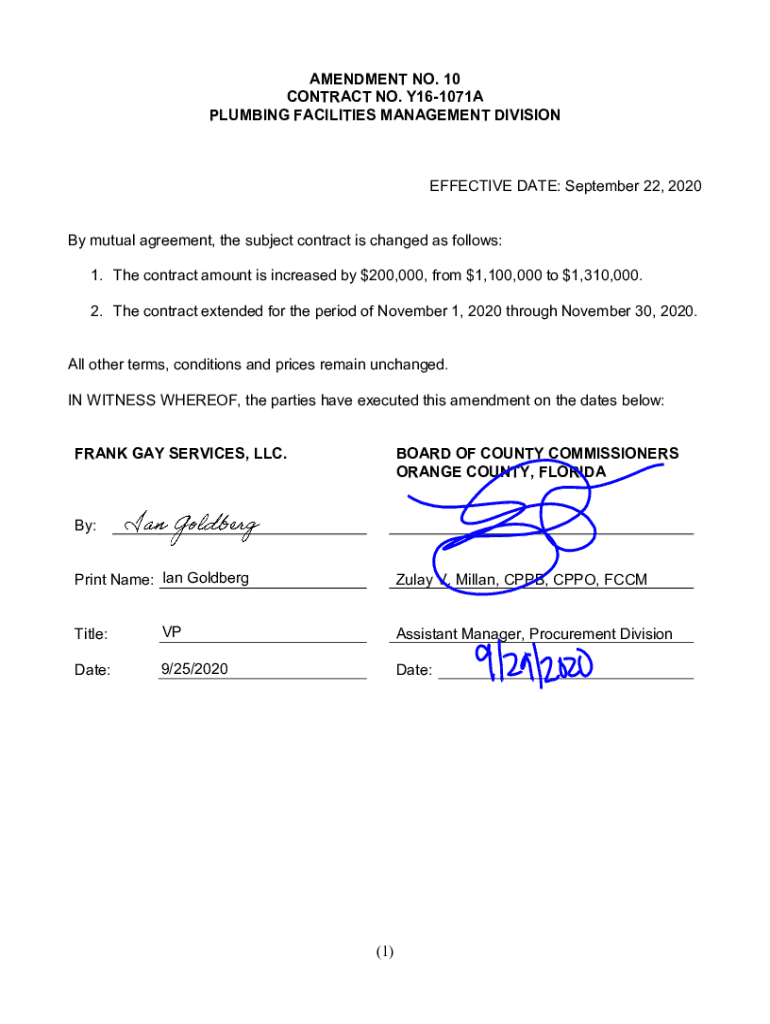 AMENDMENT NO. 10 CONTRACT NO. Y161071A PLUMBING FACILITIES MANAGEMENT DIVISIONEFFECTIVE DATE: September 22, 2020, By mutual agreement, the subject contract is changed as follows: 1. The contract amount