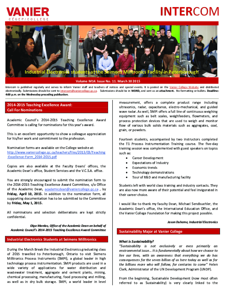 Industrial Electronics students at the Siemens Miltonic Facility in Peterborough Volume M14, Issue No. 11, March 30, 2015, Intercom is published regularly and serves to inform Zanier staff and teachers