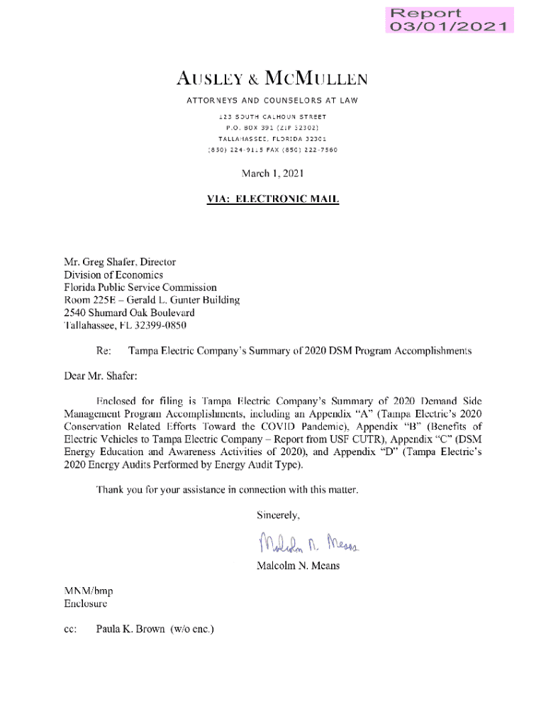 Report 03/01/2021AUSLEY & McMullin ATTORNEYS AND COUNSELORS AT LAW 1 23 Sous TH CA LH OF N S TR E ET P. O. BO X 3 9 1 ZIP 3 2 30 2) T A LL A H AS S E, FLO R ID A 3 230 1 8 50) 224 9 11 5 FAX 850)