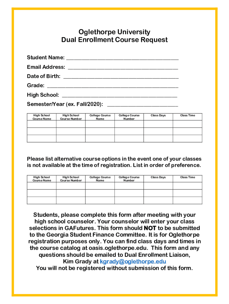 Oglethorpe University Dual Enrollment Course Request Student Name: ___ Email Address: ___ Date of Birth: ___ Grade: ___ High School: ___ Semester/Year (ex. Fall/2020): ___ High School Course Raleigh