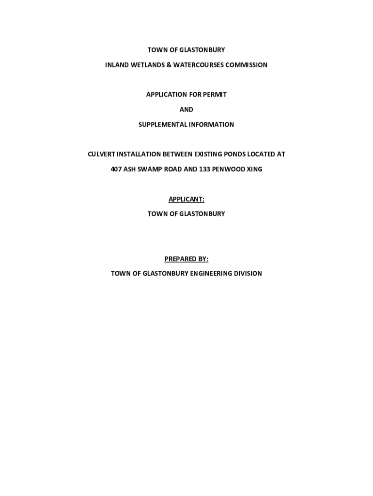 TOWN OF GLASTONBURY INLAND WETLANDS & WATERCOURSES COMMISSIONAPPLICATION FOR PERMIT AND SUPPLEMENTAL INFORMATIONCULVERT INSTALLATION BETWEEN EXISTING PONDS LOCATED AT 407 ASH SWAMP ROAD AND 133 KENWOOD