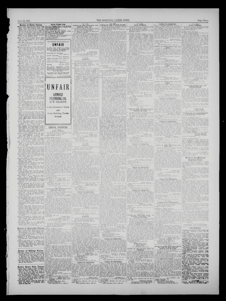 THE MONTANA LABOR NEWS June 22, 1944, Butte Unfair Listener of Butte Unions No. 9,55#No. 12.326Page Three No. 40,914NOTICE TO CREDITORS No. 40,938OF SALE OF REAL ESTATE ALIAS SI MOONS of JOHANNA WILLIAMS,