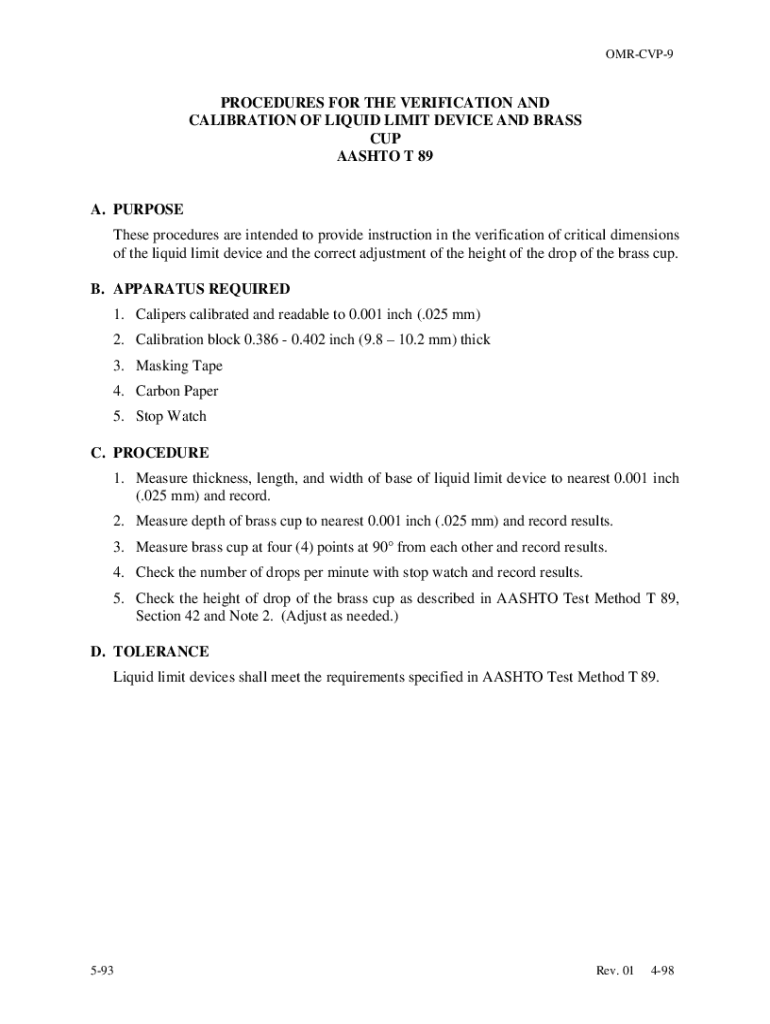 OMRCVP9PROCEDURES FOR THE VERIFICATION AND CALIBRATION OF LIQUID LIMIT DEVICE AND BRASS CUP AAS HTO T 89A. PURPOSE These procedures are intended to provide instruction in the verification of critical