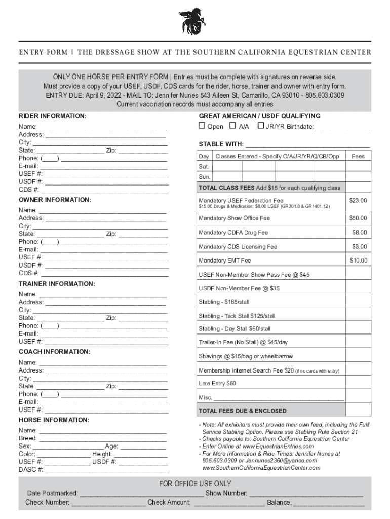 ENTRY FORM | THE DRESSAGE SHOW AT THE SOUTHERN CALIFORNIA EQUESTRIAN CENTER ONLY ONE HORSE PER ENTRY FORM | Entries must be complete with signatures on reverse side. Must provide a copy of your USED,