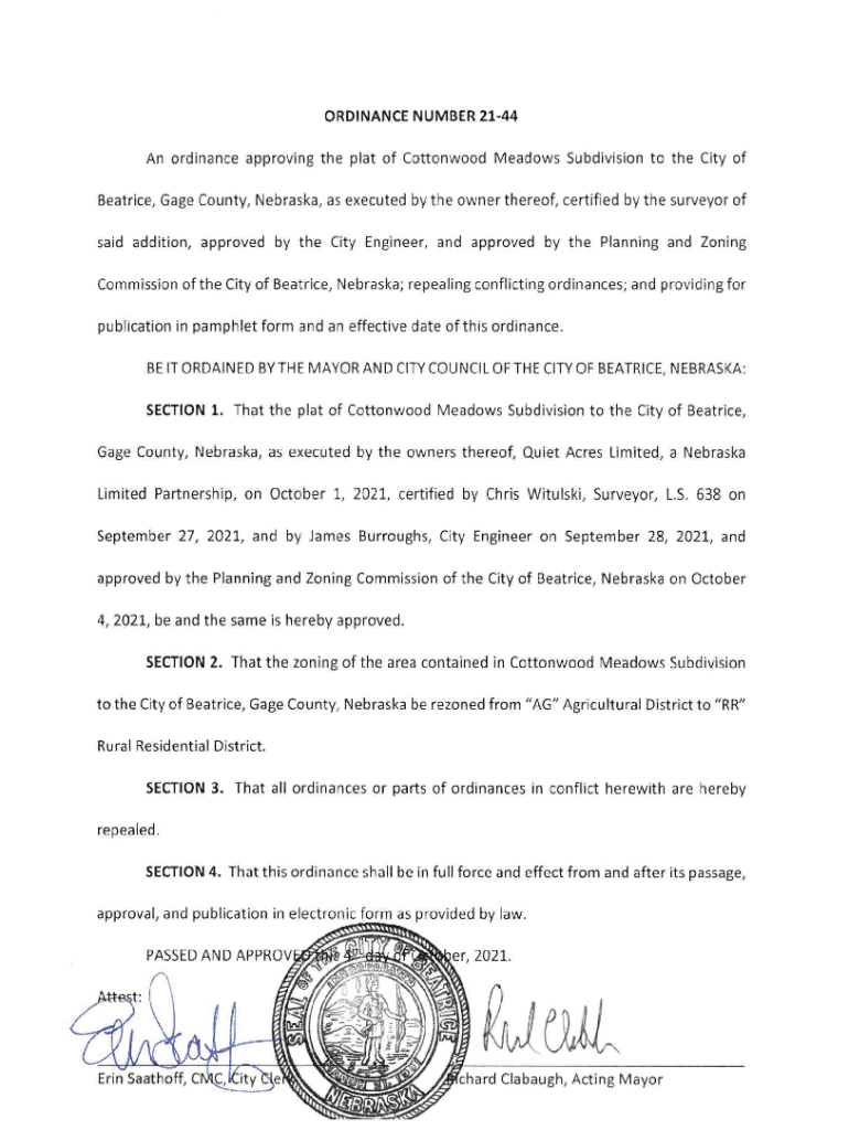 Get the free An ordinance approving the plat of Cottonwood Meadows ...